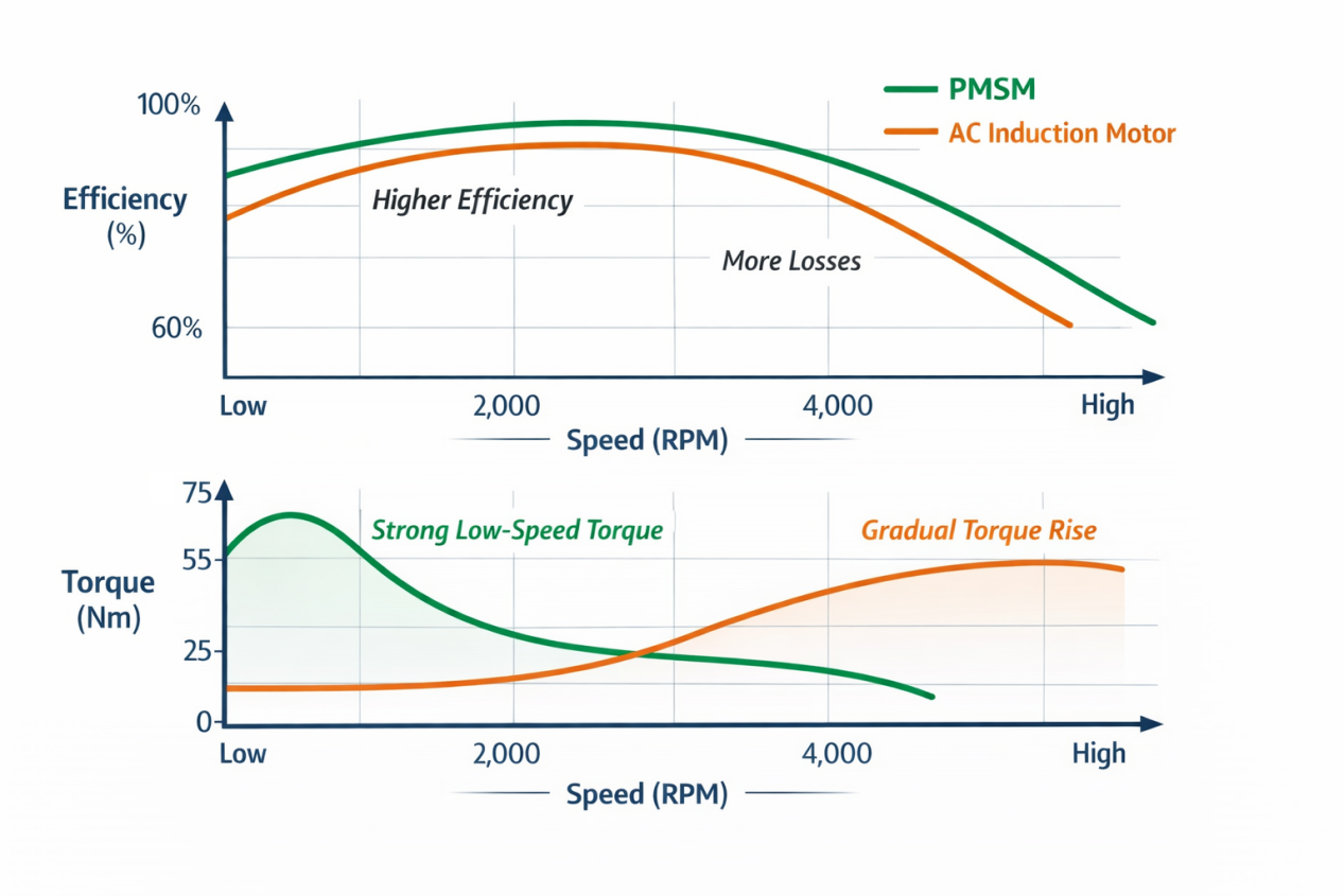 ⭐ PMSM motors are known for smooth and responsive low-speed torque, which can improve acceleration control and hill-start performance.